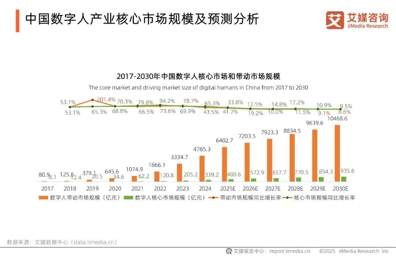 除此之外,在传媒、证券、电商等领域,数字分身也不算什么新鲜事。2025年的“6·18”,罗永浩的数字分身直播带货也吸引了不少人关注。艾媒咨询数据显示,2024年,中国数字人核心市场规模已达到339.2亿元,预计2030年将达到935.6亿元;2024年数字人带动市场规模为4785.3亿元,预计2030年为10468.6亿元。