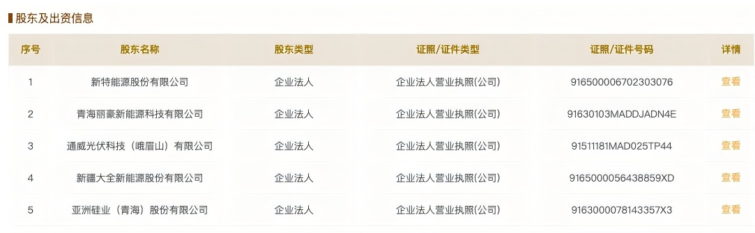 根据公示信息,光和谦成由10个股东共同持股。股东包括新特能源(01799.HK)、青海丽豪新能源科技有限公司(以下简称“青海丽豪”)、通威光伏科技(峨眉山)有限公司(以下简称“通威光伏”)、大全能源(688303.SH)、亚洲硅业(青海)股份有限公司、青海南玻新能源科技有限公司、北京中光同合能源科技有限公司(以下简称“中光同合”)、协鑫科技咨询服务(苏州)有限公司(以下简称“协鑫咨询”)、新疆戈恩斯能源科技有限公司和上海东方希望新能源科技有限公司。
